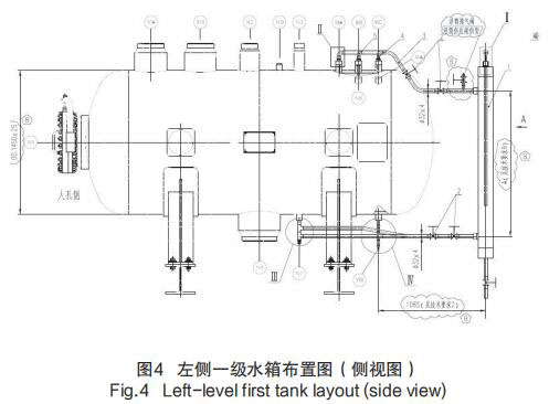 1)在每個(gè)疏水箱外部靠近水側(cè)取壓口處,安裝 3 個(gè)測(cè)量筒用于導(dǎo)波純水處理液位計(jì)的安置以及液位測(cè)量;每個(gè)測(cè)量筒的汽側(cè)取壓口仍然選用原導(dǎo)波純水處理液位計(jì)接口,而水側(cè)取壓口引用原水汽取樣口、磁翻板液位計(jì)取壓口,以左側(cè)一級(jí)水箱布置圖為例,見(jiàn)圖 4 左側(cè)一級(jí)水箱布置圖(側(cè)視圖)。